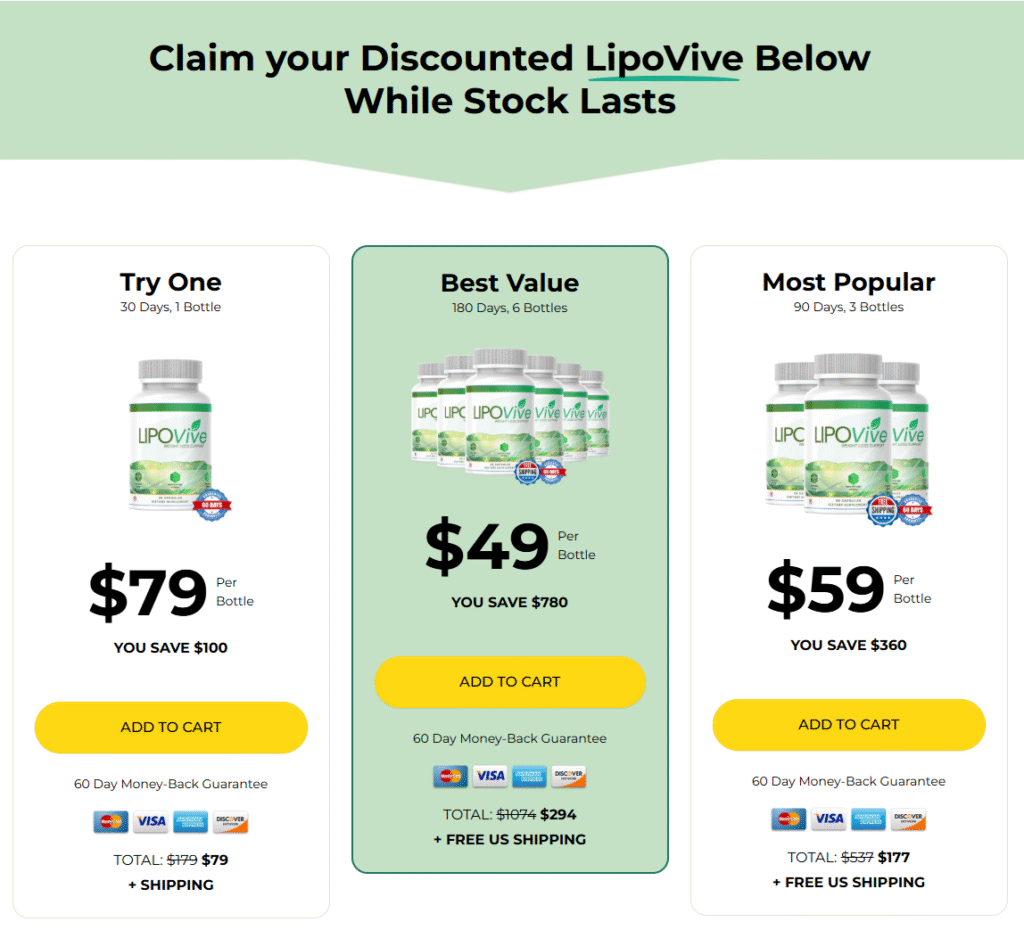 Currently, LipoVive is backed by a 60-day money-back guarantee. Free shipping is available on select multi-bottle packages, along with additional discounts.